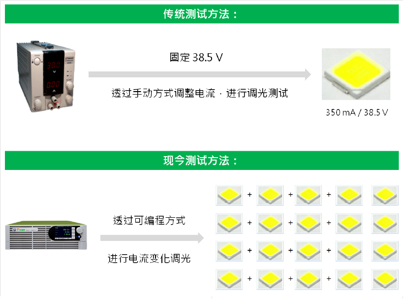 根據(jù) TrendForce《2021全球LED照明市場(chǎng)報(bào)告- 照明級(jí)封裝與照明產(chǎn)品趨勢(shì)(1H21)》顯示,全球LED照明市場(chǎng)發(fā)展樂(lè)觀, 2025年預(yù)估可達(dá)443億美金。LED照明市場(chǎng)無(wú)疑帶動(dòng)關(guān)聯(lián)的上、中、下游產(chǎn)業(yè)發(fā)展,其中,在生產(chǎn)制程及檢測(cè)中,芯片與封裝測(cè)試為不可忽視的重要環(huán)節(jié)。在各個(gè)制程的最終階段,會(huì)透過(guò)測(cè)試電源,進(jìn)行升溫、調(diào)光、老化測(cè)試,確認(rèn)其安全性與精準(zhǔn)度。傳統(tǒng)測(cè)試方法僅針對(duì)單個(gè)或數(shù)個(gè)包裝,手動(dòng)調(diào)整電流進(jìn)行調(diào)光測(cè)試,費(fèi)時(shí)又費(fèi)力,如今使用可編程直流電源,可一次同時(shí)測(cè)試多個(gè)LED芯片,提升測(cè)試速率與產(chǎn)能。