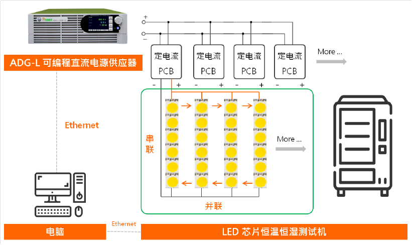 我們使用ADG-L可編程直流電源,進(jìn)行LED產(chǎn)品老化測(cè)試。透過(guò)遠(yuǎn)程計(jì)算機(jī), 以Ethernet通訊方式,鏈接恒溫恒濕測(cè)試機(jī)內(nèi)串并接好的LED 芯片模塊,提供每個(gè)芯片穩(wěn)定的電壓及電流。