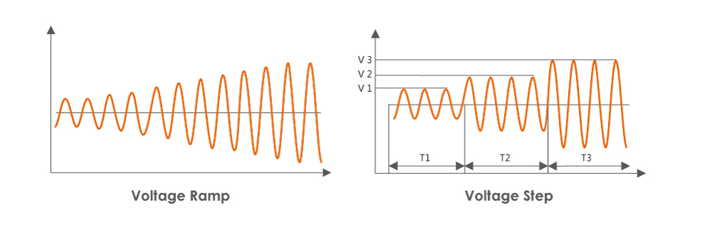 能分別設定24 組、12 組不同輸出電壓、輸出頻率及時間的步階與漸變記憶組,且可循環數百次。舉例來說,用戶可設定頻率45Hz逐漸增加到120Hz或電壓由0V逐漸增加到310V,模擬單一或連續的測試變化,以取代單純設置固定參數的測試方法;輕松完成復雜的測試程序,滿足各種負載輸入的特性。