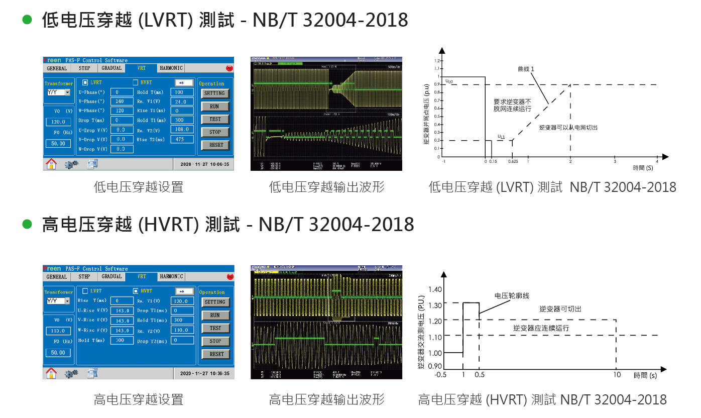 PAS 內(nèi)建的高/低電壓穿越(HVRT/LVRT) 模式,可輕易的模擬各法規(guī)之相關(guān)電壓跌落與驟升狀況。