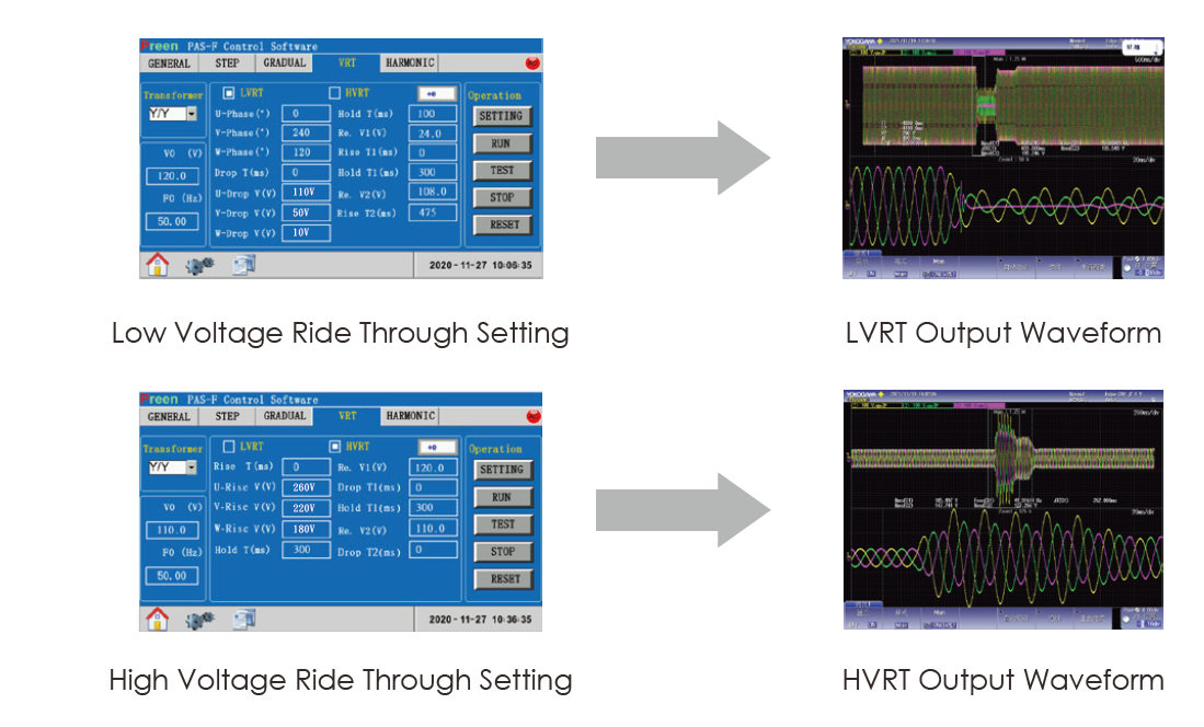PAS 內(nèi)置高/ 低電壓穿越功能(HVRT/LVRT),可進(jìn)行電網(wǎng)故障清除的模擬。電壓、頻率,跌落電壓,恢復(fù)電壓,上升時(shí)間和維持時(shí)間等均可設(shè)定,也可進(jìn)行電網(wǎng)故障清除的模擬。