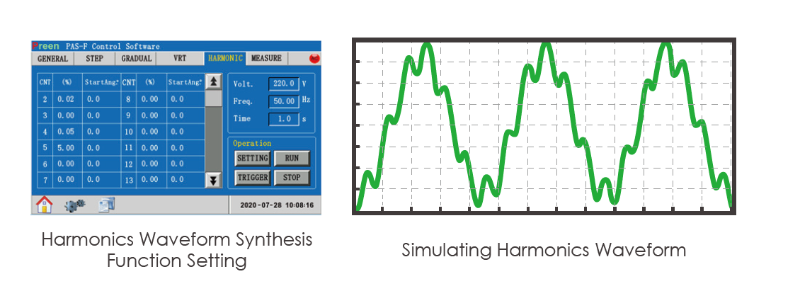 PAS系列的總諧波失真波形合成功能,可讓用戶(hù)編輯不同的諧波成份,來(lái)合成總諧波失真波形,透過(guò)基頻為50Hz或60Hz,簡(jiǎn)單編程每一階的電壓振幅大小及輸出起始相位,合成的諧波成份可達(dá)25階。